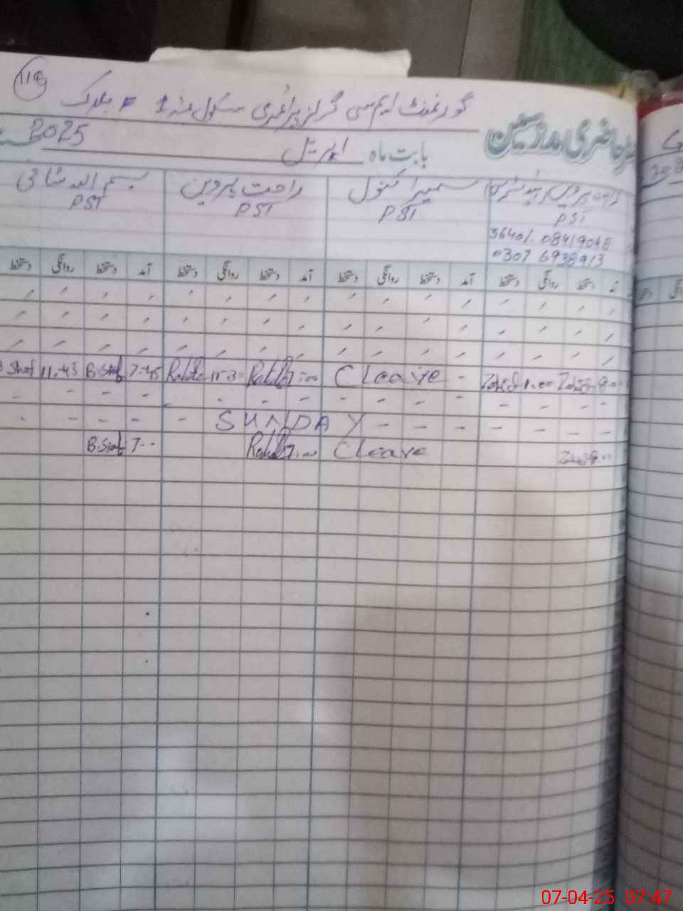 | CNIC | Full Name | Designation | R/C | Absence During Last Calender Month |