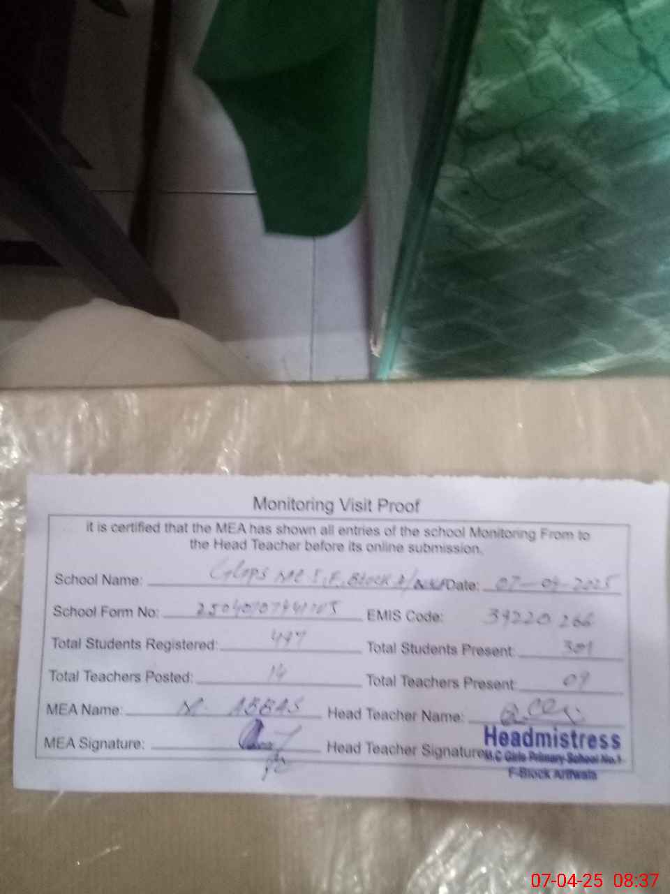 | Attendance Register | Head Teacher | MEA with School | Visit Proof |