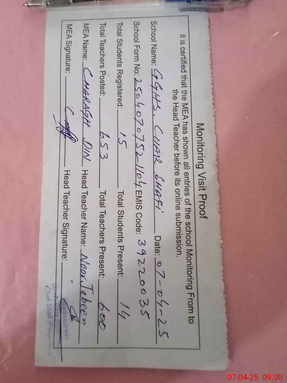| EMIS Code: 39220035 | Name of School: GGHS CHAK SHAFI | |||