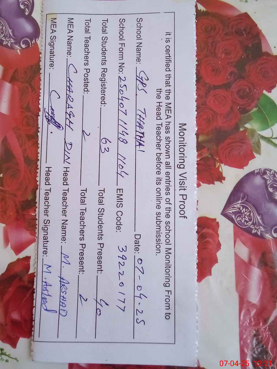 | EMIS Code: 39220177 | Name of School: GPS THATHAI P/O SAME TEH ARIF WALA | |||
