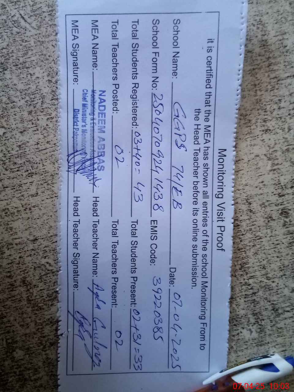 | EMIS Code: 39220385 | Name of School: GGPS 74 EB ARIFWALA | |||