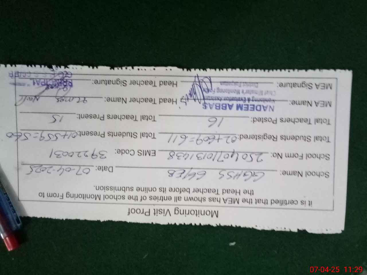 | Attendance Register | Head Teacher | MEA with School | Visit Proof |