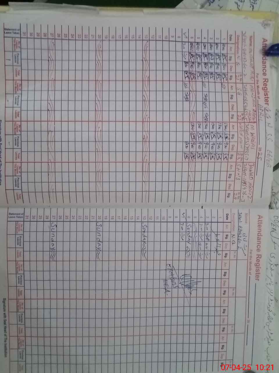 | CNIC | Full Name | Designation | R/C | Absence During Last Calender Month |