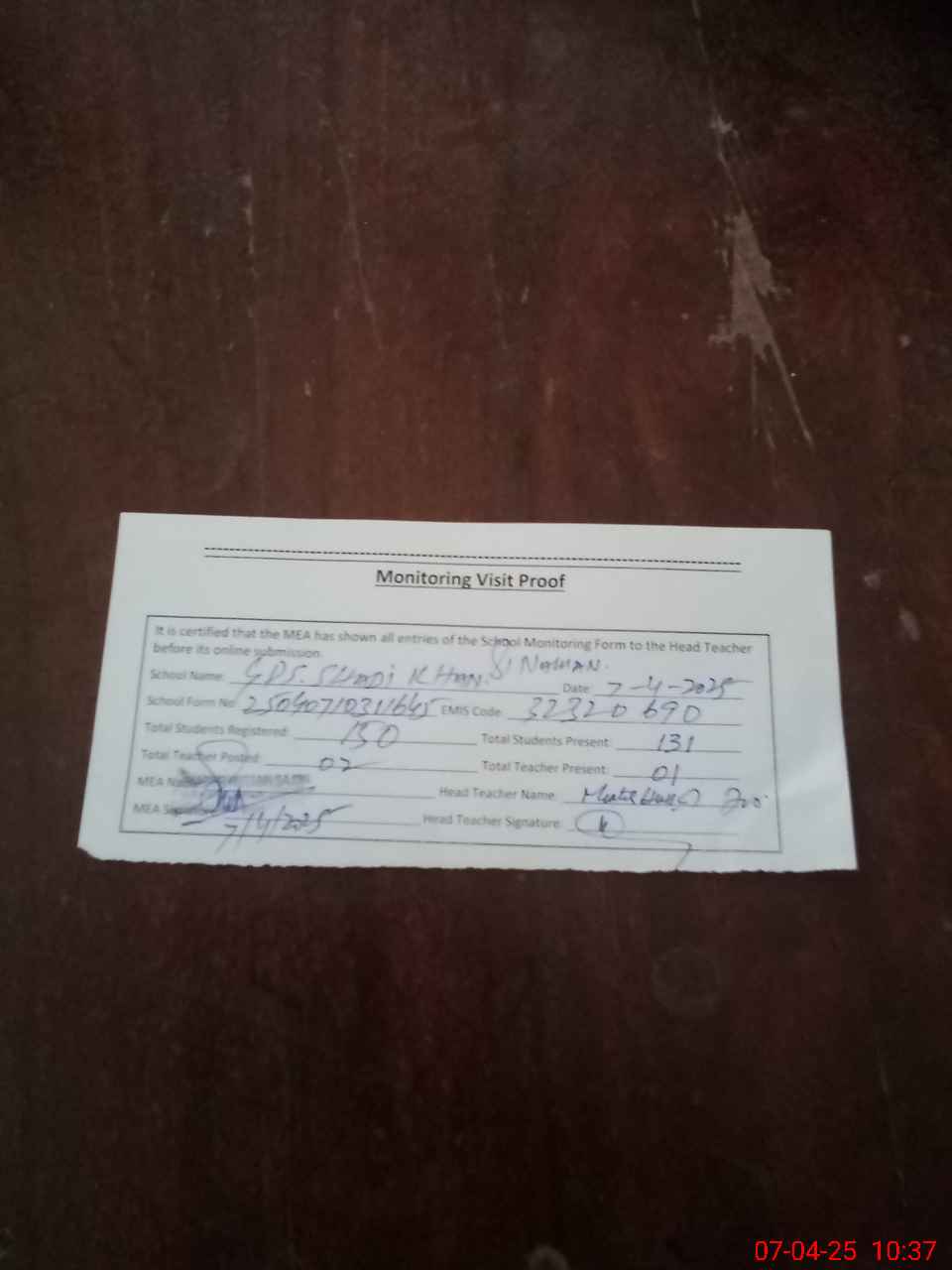 | Attendance Register | Head Teacher | MEA with School | Visit Proof |