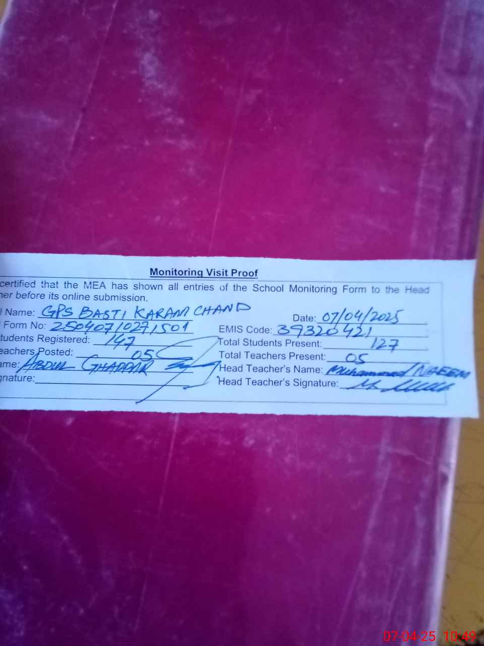 | Attendance Register | Head Teacher | MEA with School | Visit Proof |