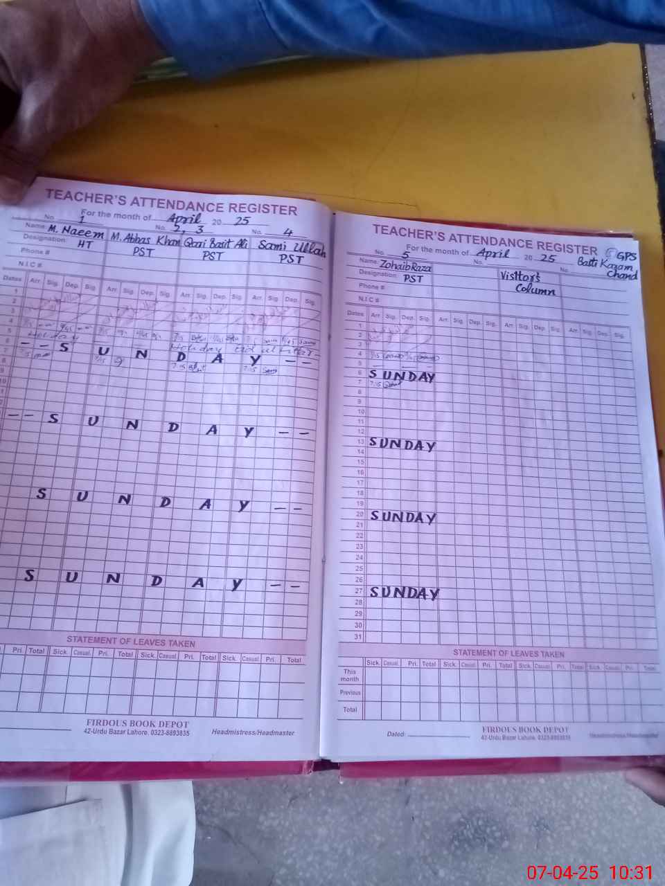 | CNIC | Full Name | Designation | R/C | Absence During Last Calender Month |