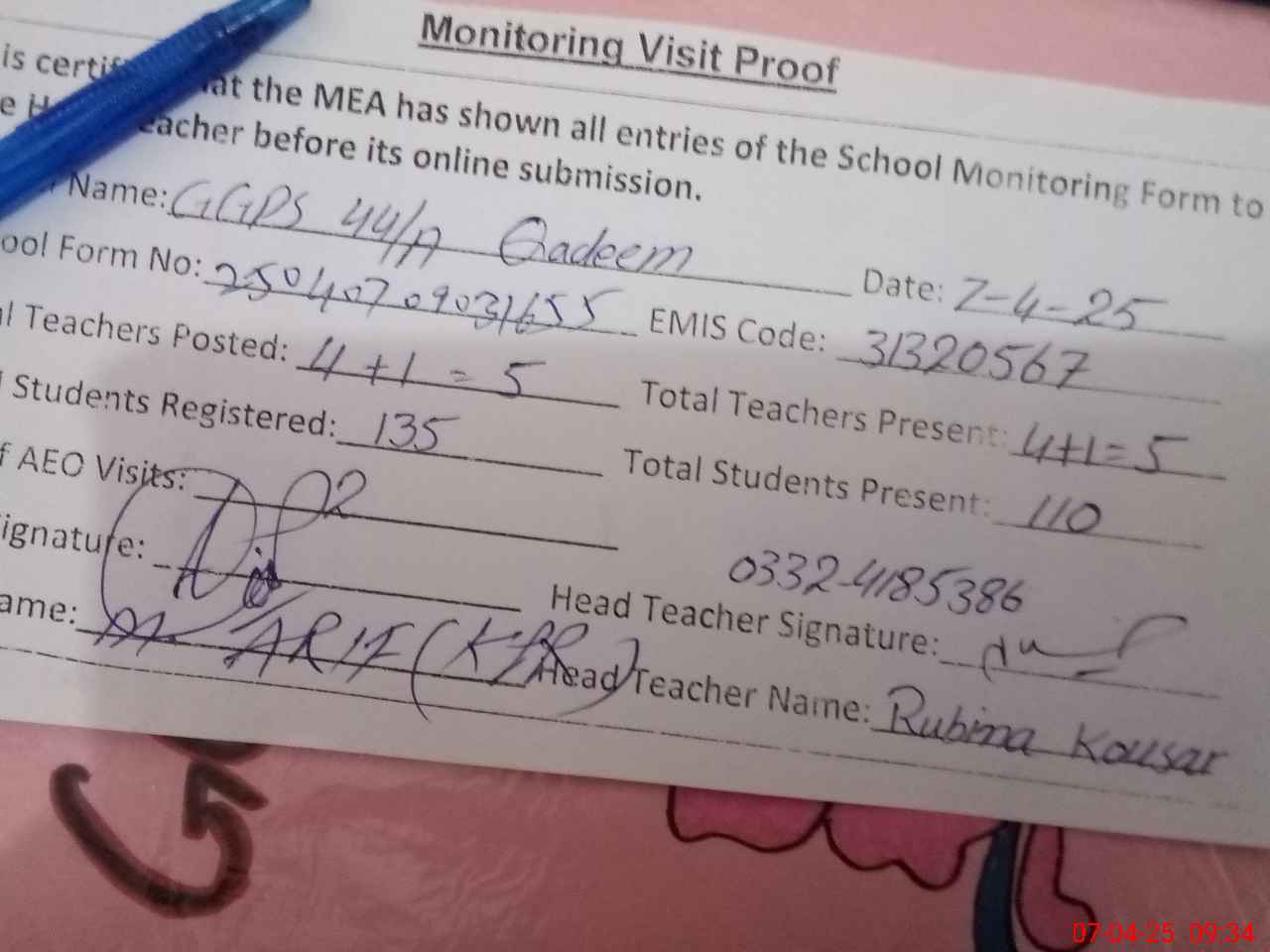 | EMIS Code: 31320567 | Name of School: GGPS CHAK 44/A QADEEM | |||
