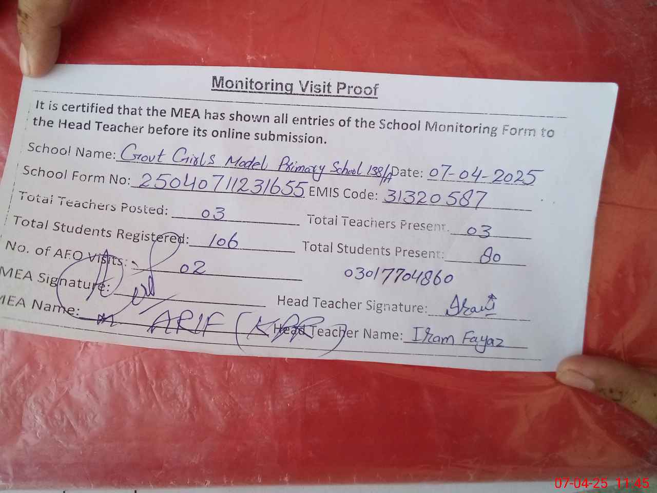 | Attendance Register | Head Teacher | MEA with School | Visit Proof |