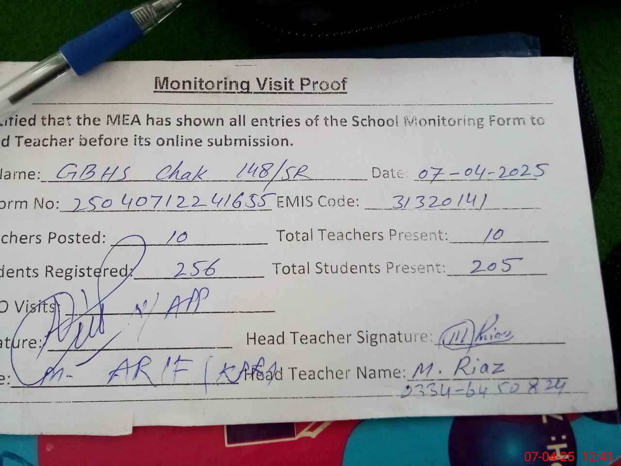 | EMIS Code: 31320141 | Name of School: GHS CHAK 148/A | |||