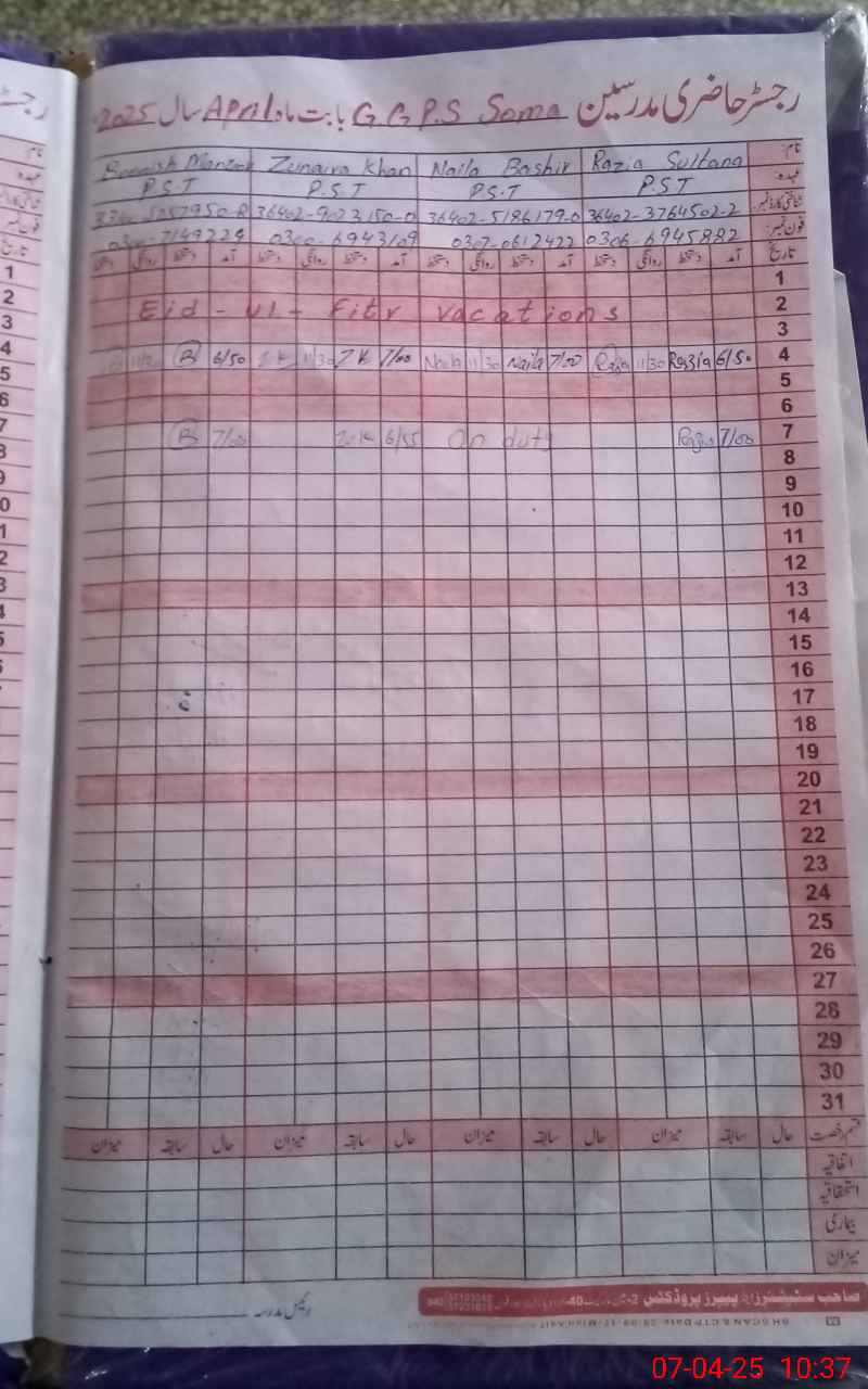 | Name: Zu**** Kh**** Designation: (School Headmaster's/Headmistress's) PST Phone/Cell Number: 03**** |