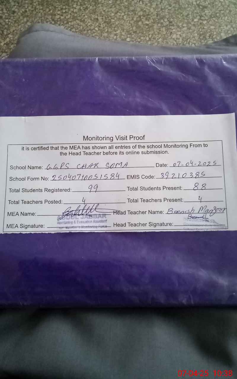 | EMIS Code: 39210385 | Name of School: GGPS CHAK SOMA | |||