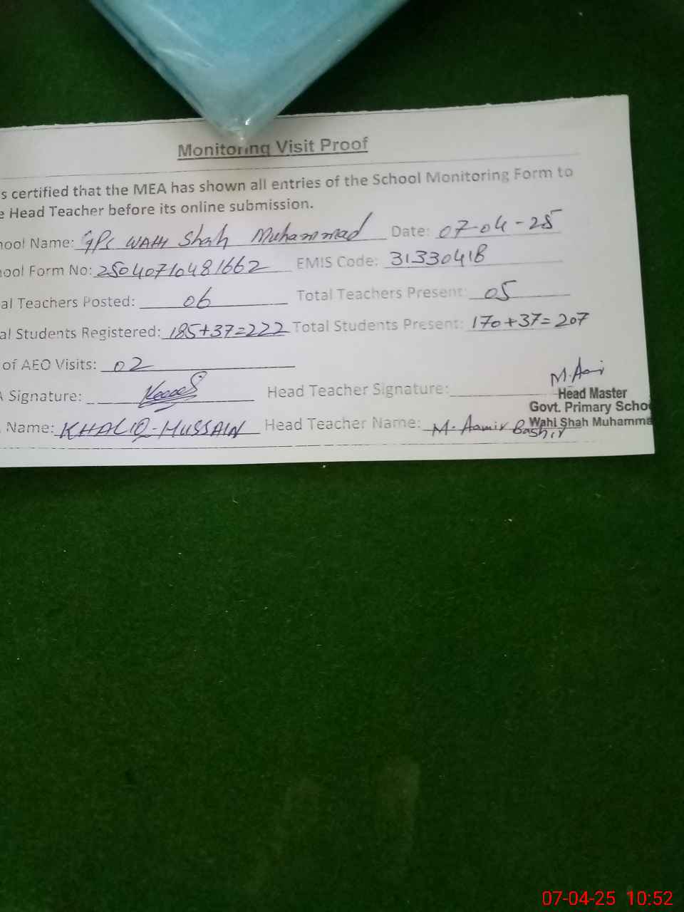 | Name: AM**** BA**** Designation: (School Headmaster's/Headmistress's) PST Phone/Cell Number: 03**** |