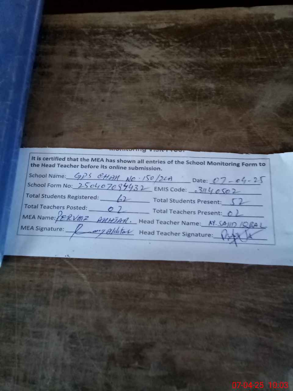 | Attendance Register | Head Teacher | MEA with School | Visit Proof |
