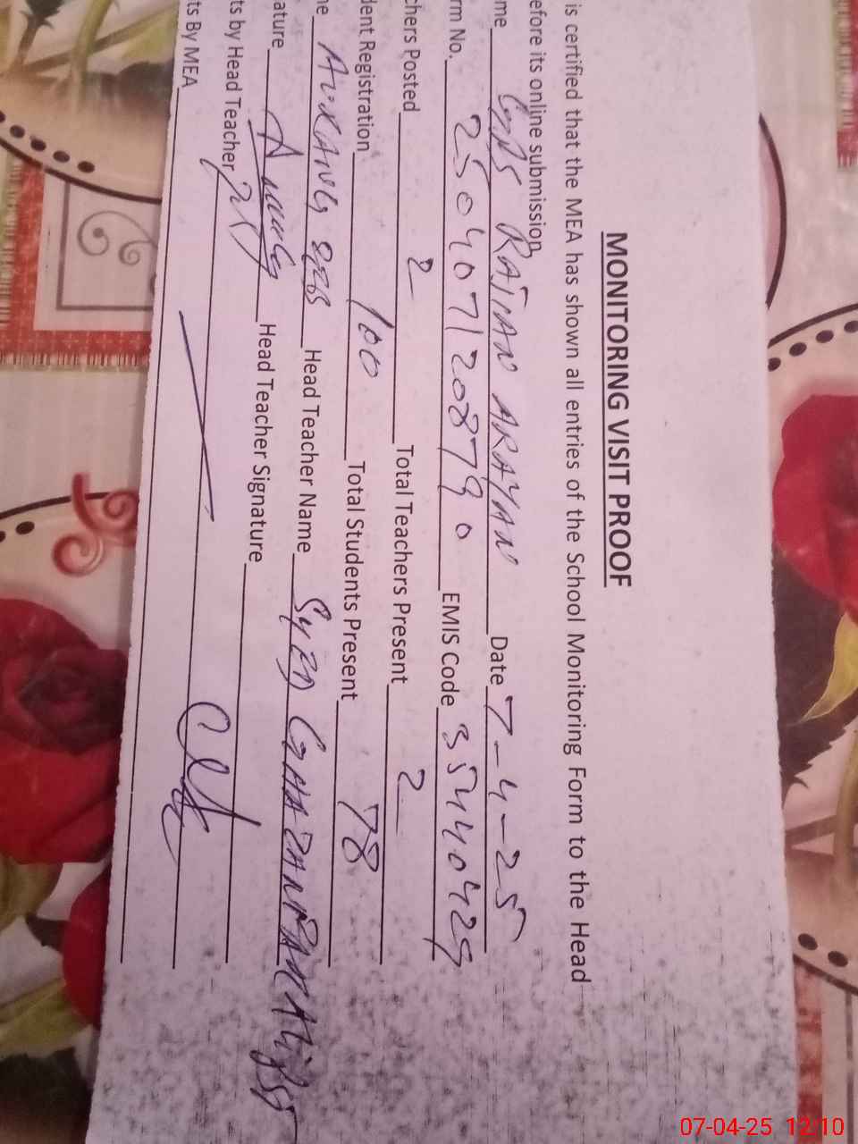 | Attendance Register | Head Teacher | MEA with School | Visit Proof |