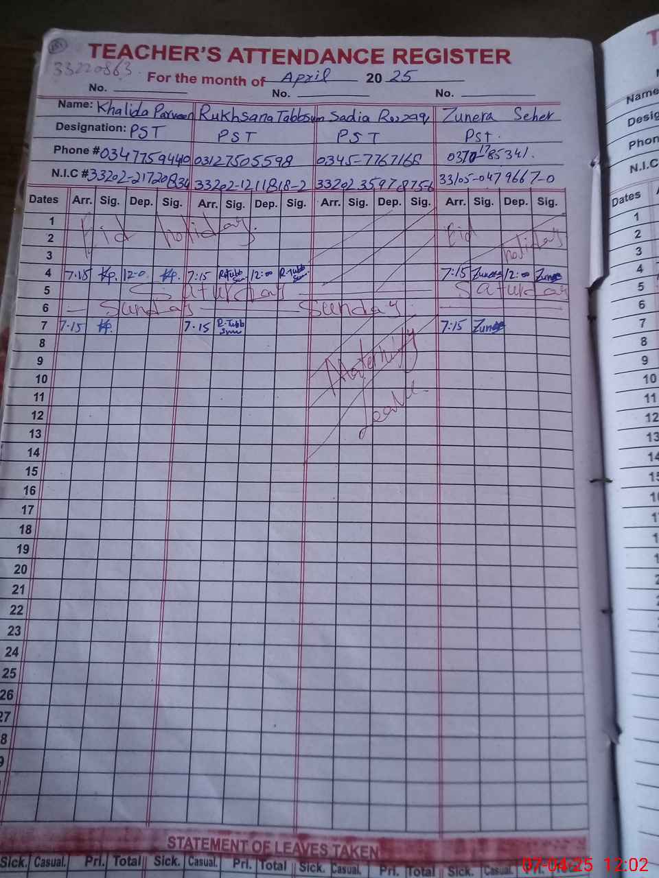 | CNIC | Full Name | Designation | R/C | Absence During Last Calender Month |