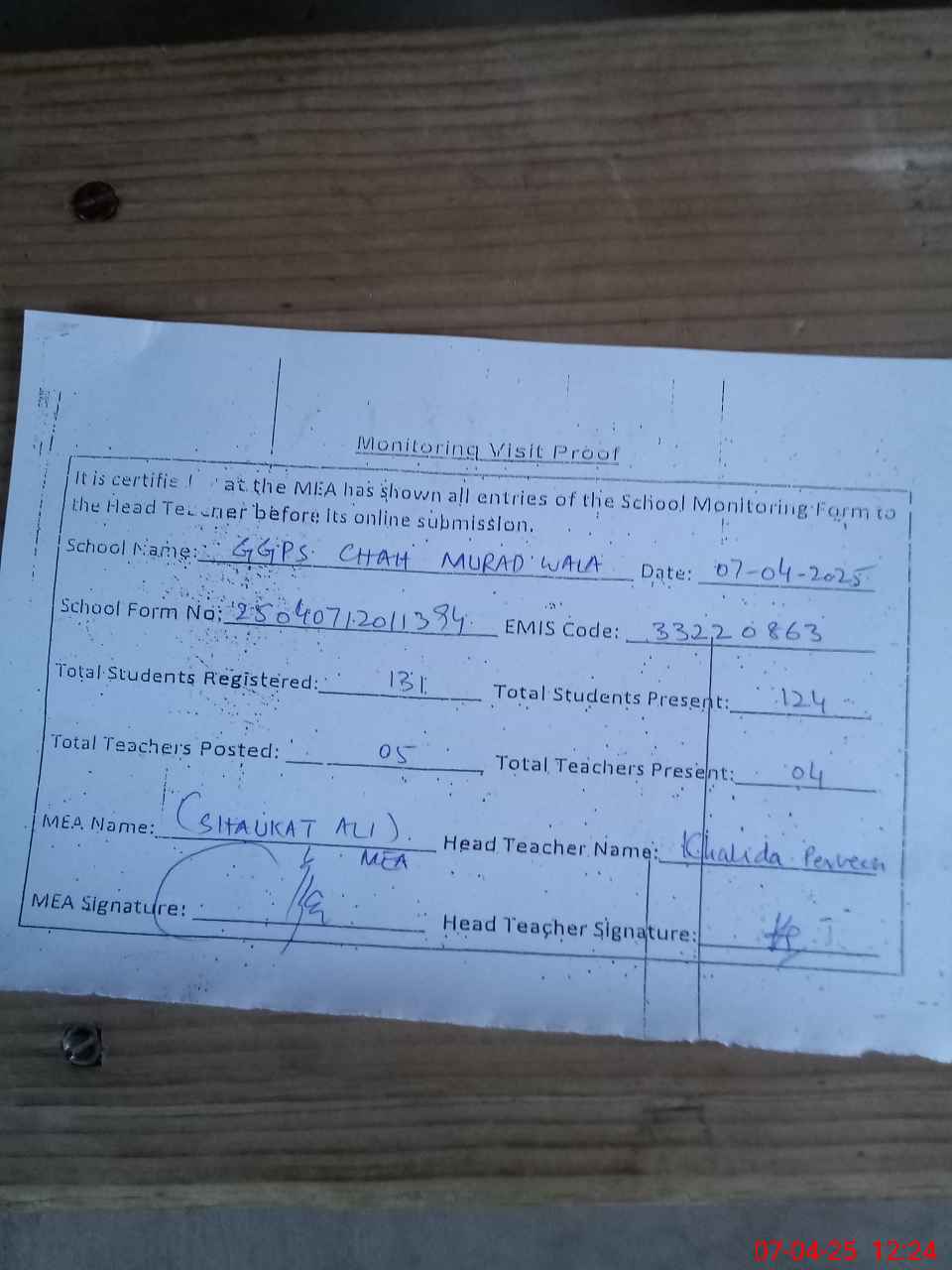 | Attendance Register | Head Teacher | MEA with School | Visit Proof |