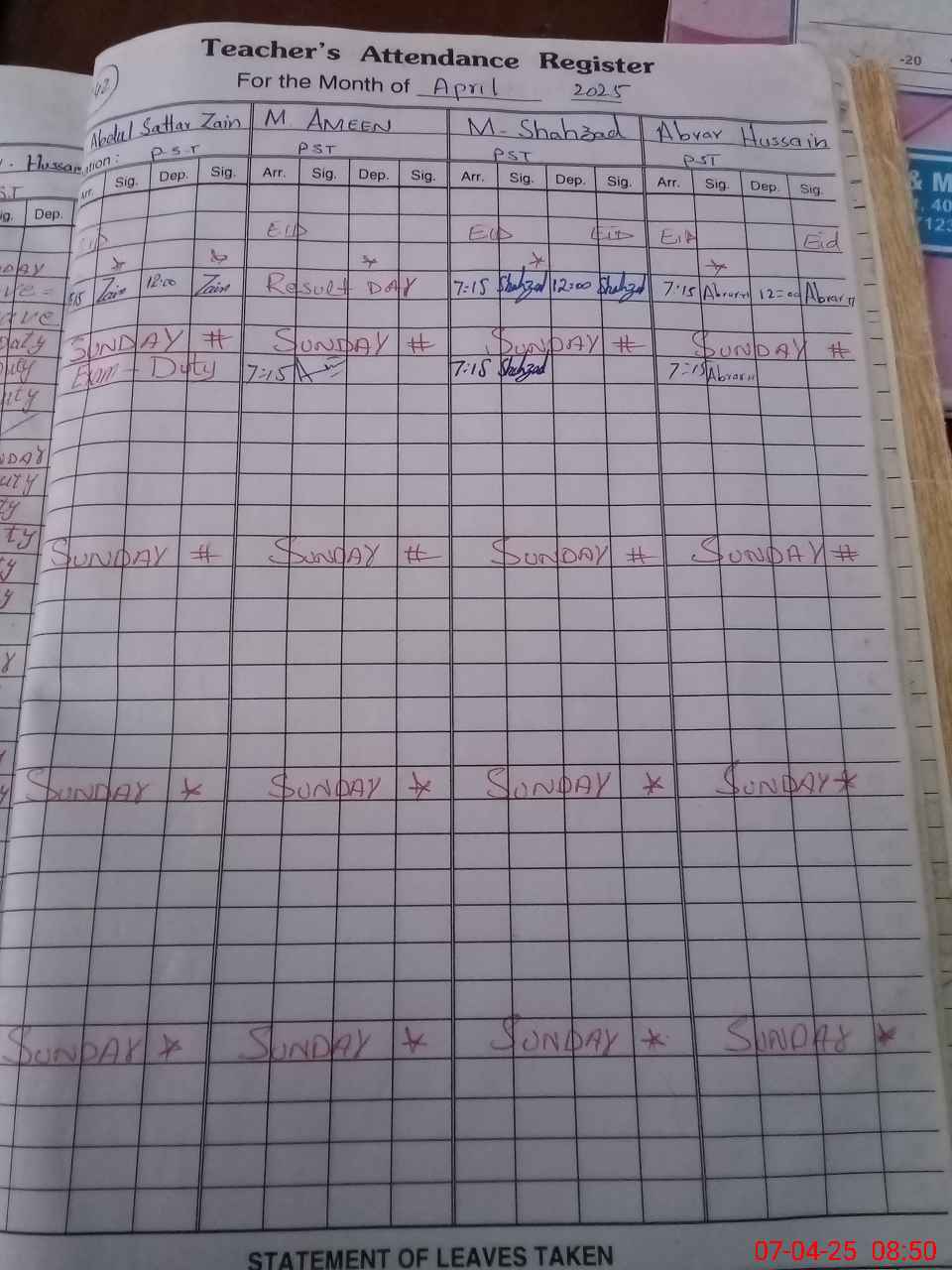 | 31**** | Ab**** Sa**** Za**** | Contract | 0 | 8 | 0 | 0 | 0 | 0 | 0 | 0 | 0 | Exam Duty | |