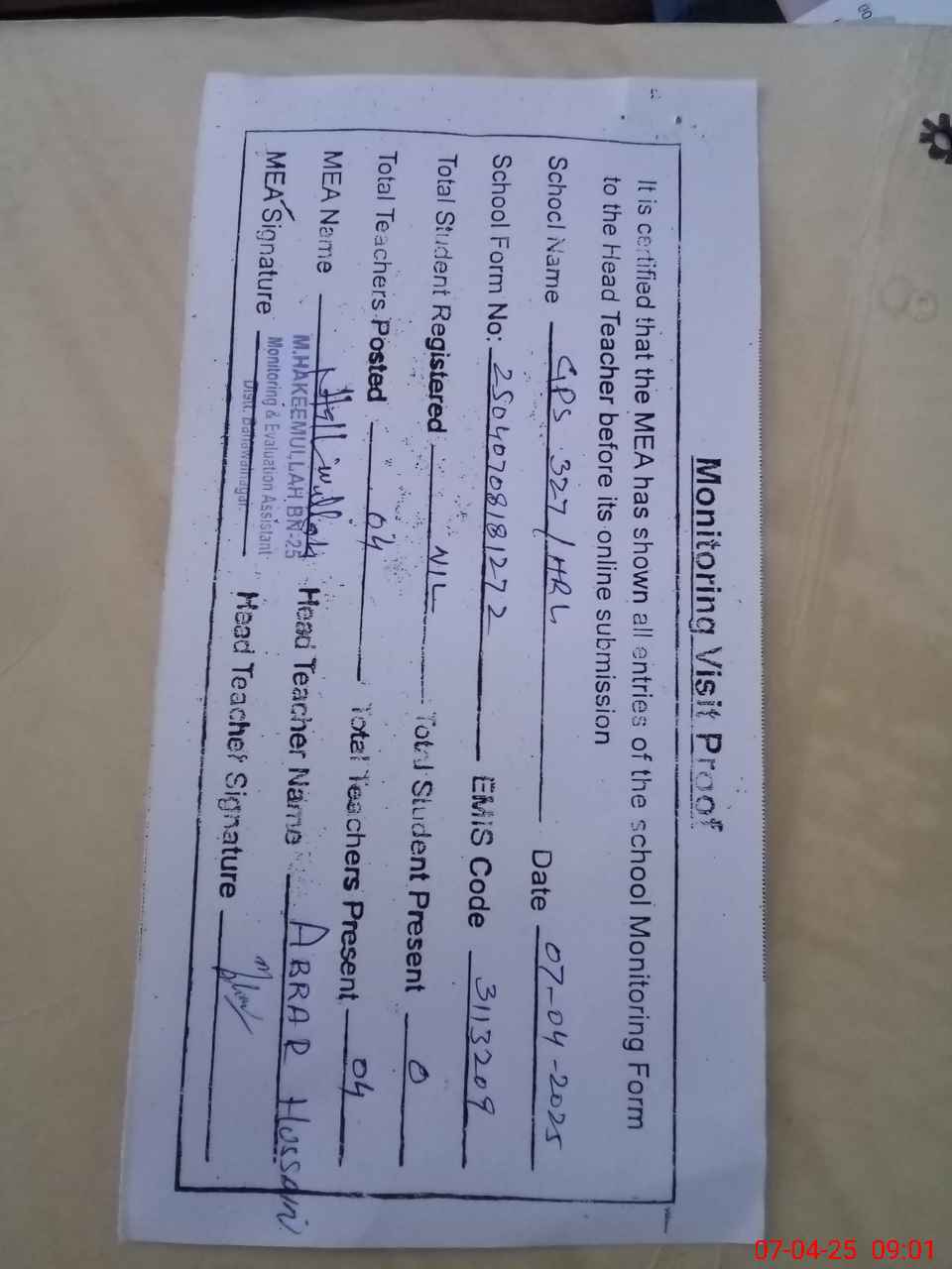 | EMIS Code: 31130209 | Name of School: GPS CHAK NO.327/HRL | |||