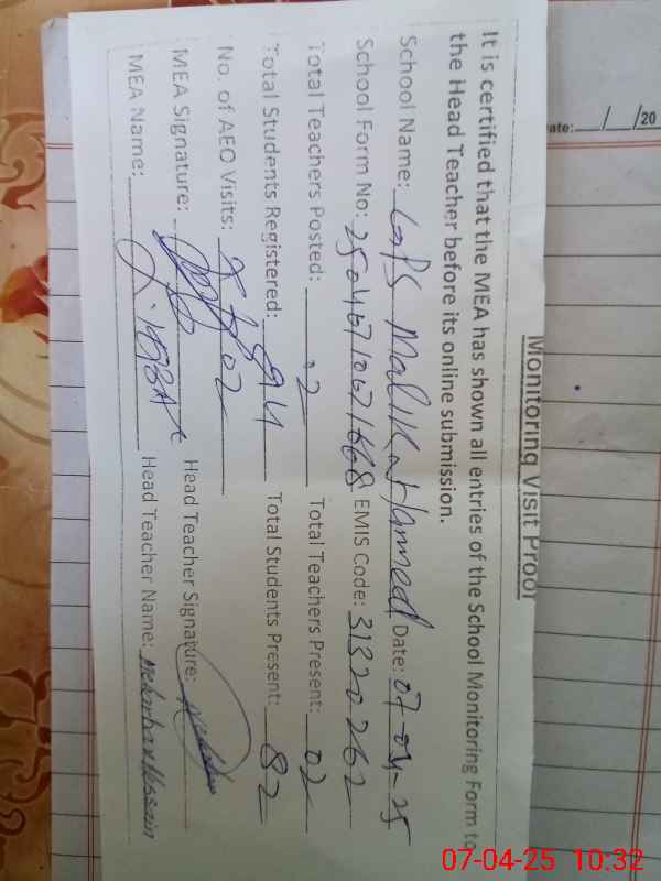 | EMIS Code: 31320262 | Name of School: GPS MALIK HAMEED | |||