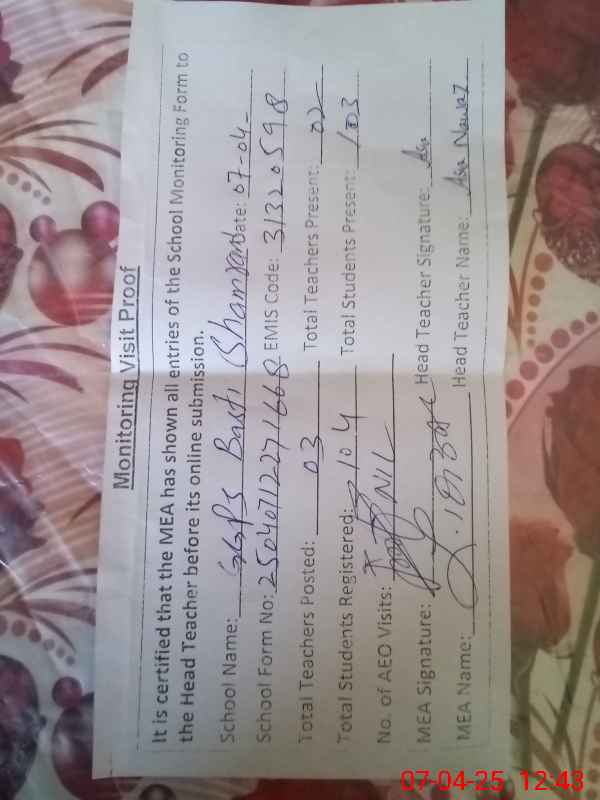 | Attendance Register | Head Teacher | MEA with School | Visit Proof |