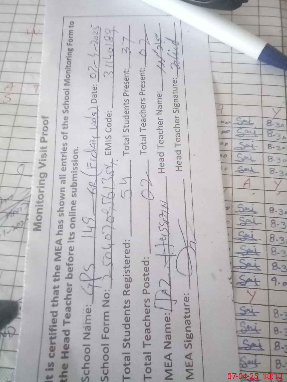 | Attendance Register | Head Teacher | MEA with School | Visit Proof |