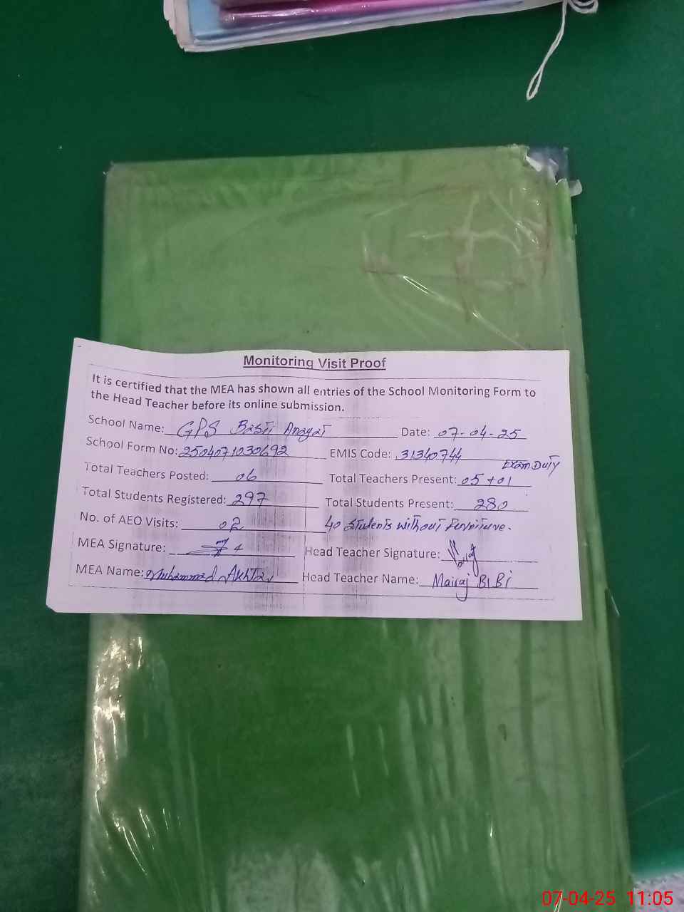 | Attendance Register | Head Teacher | MEA with School | Visit Proof |
