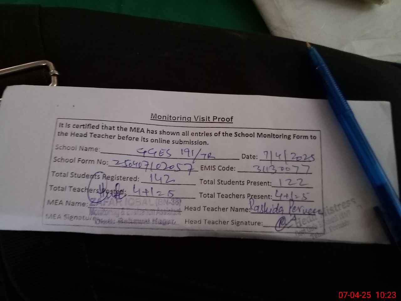 | Attendance Register | Head Teacher | MEA with School | Visit Proof |