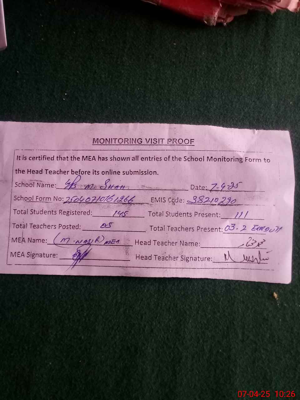 | EMIS Code: 38210290 | Name of School: GPS MUHAMMAD SHAH | |||