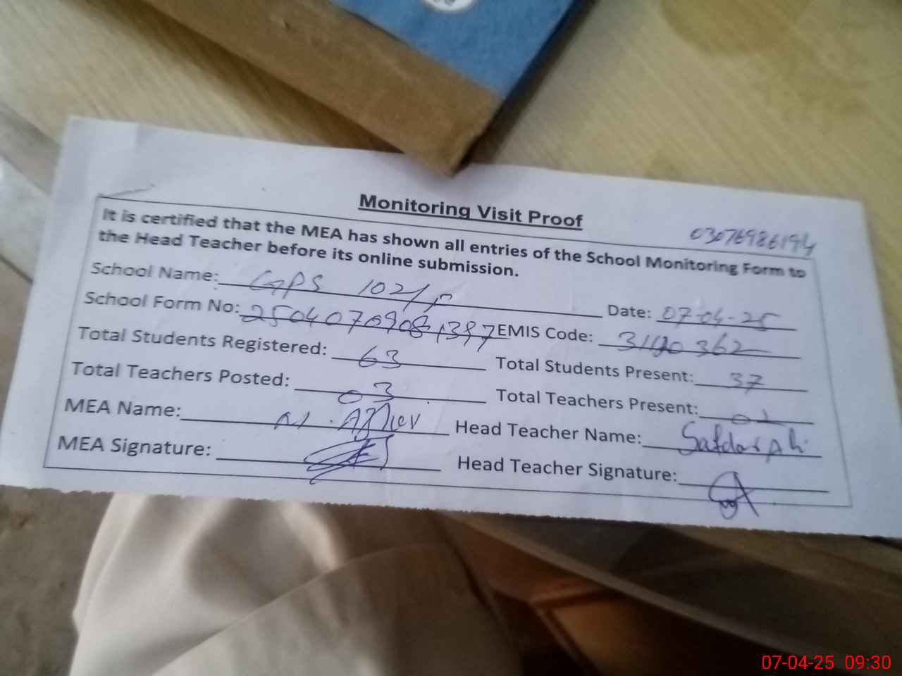 | Attendance Register | Head Teacher | MEA with School | Visit Proof |