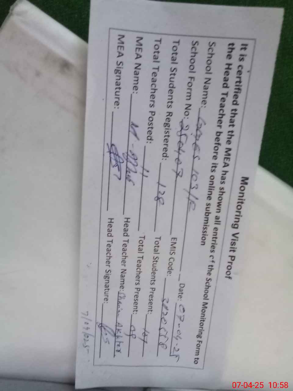 | Attendance Register | Head Teacher | MEA with School | Visit Proof |