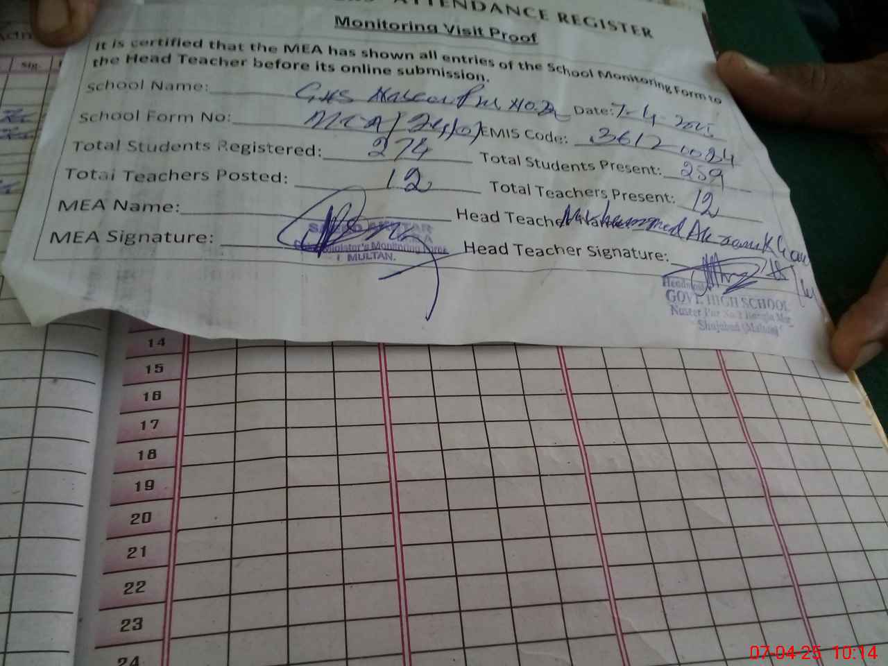 | Attendance Register | Head Teacher | MEA with School | Visit Proof |