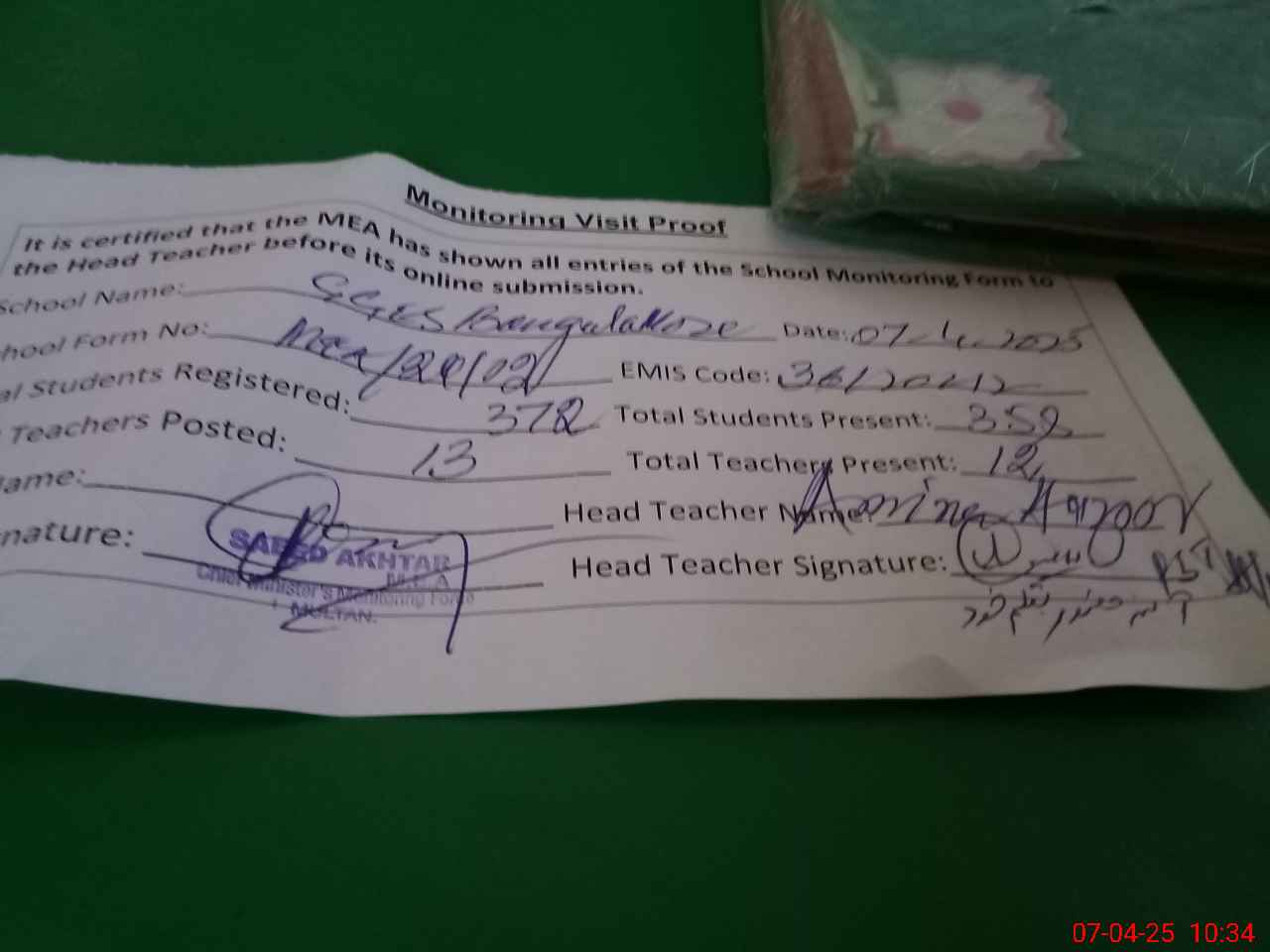 | Attendance Register | Head Teacher | MEA with School | Visit Proof |