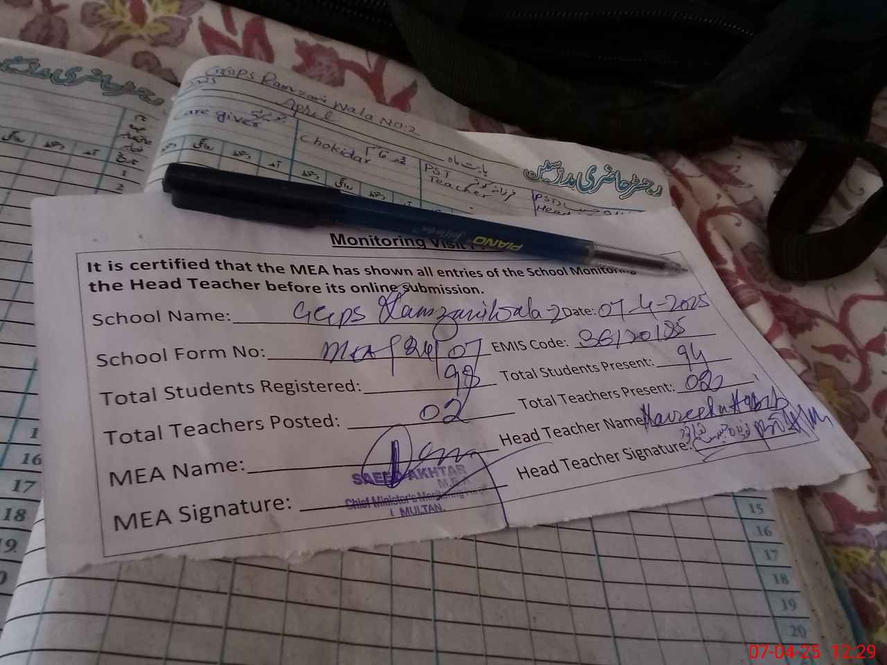| Attendance Register | Head Teacher | MEA with School | Visit Proof |