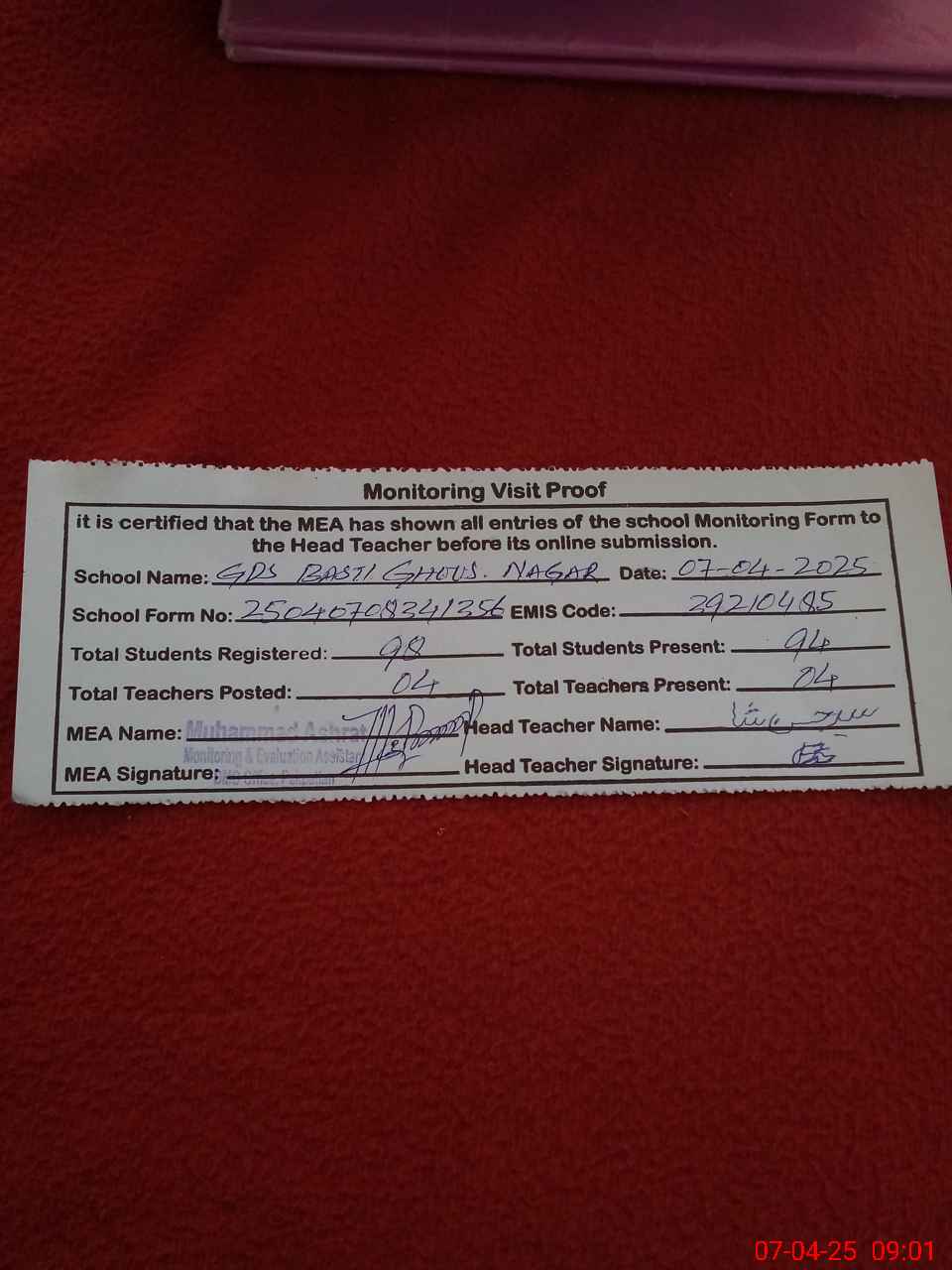 | Attendance Register | Head Teacher | MEA with School | Visit Proof |