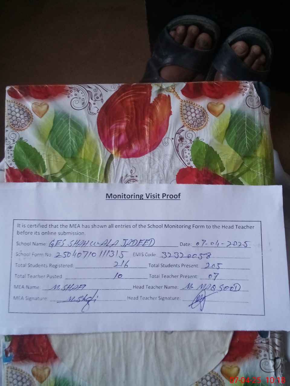 | Attendance Register | Head Teacher | MEA with School | Visit Proof |