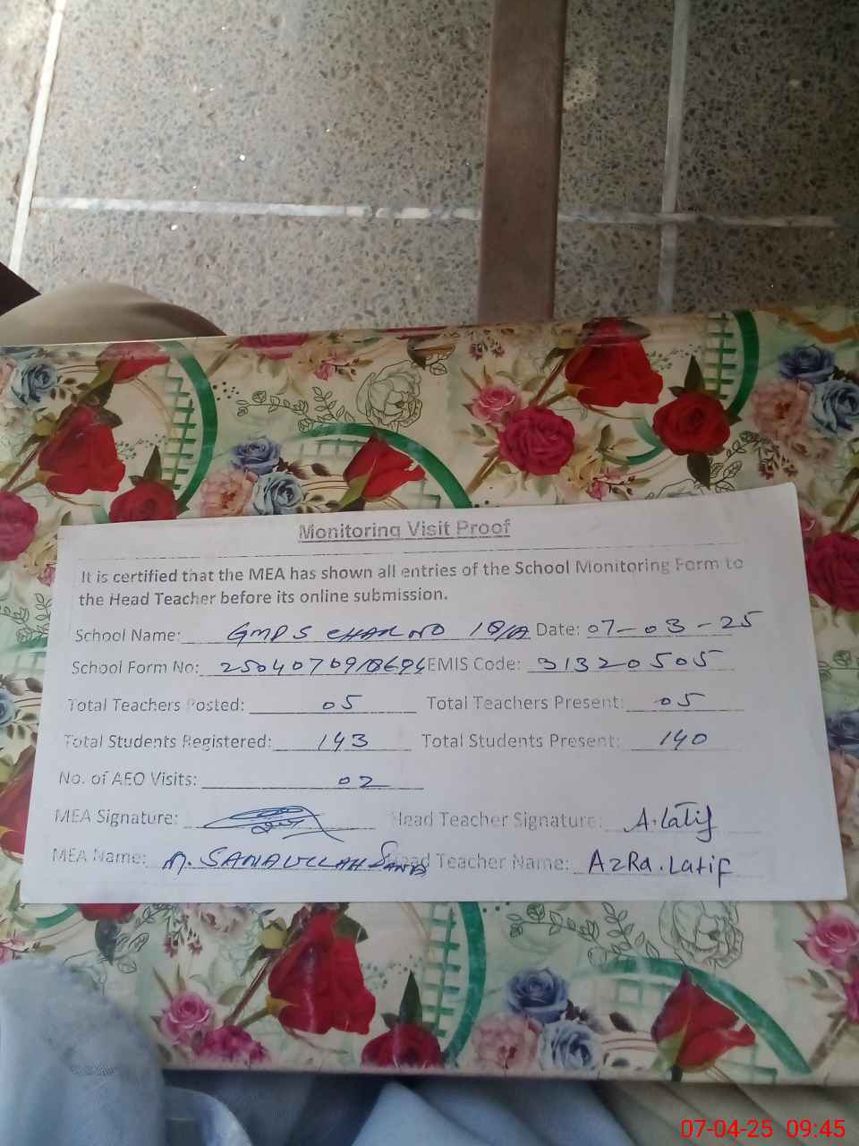 | Attendance Register | Head Teacher | MEA with School | Visit Proof |
