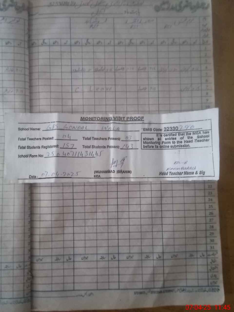 | Attendance Register | Head Teacher | MEA with School | Visit Proof |