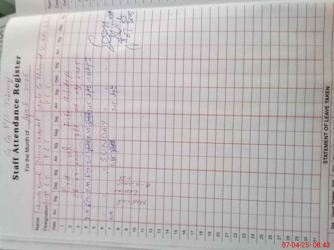 | Leave | Duty | Absent | Maternity | Medical | Ex- Pak |