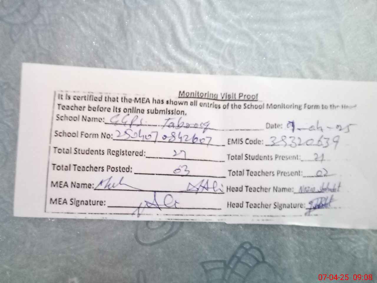 | Attendance Register | Head Teacher | MEA with School | Visit Proof |