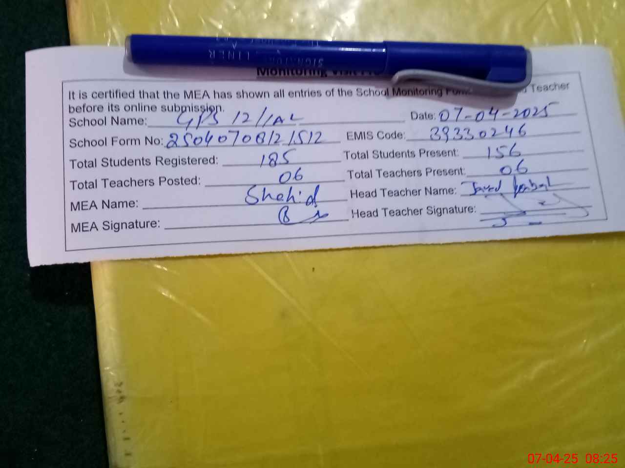 | Attendance Register | Head Teacher | MEA with School | Visit Proof |