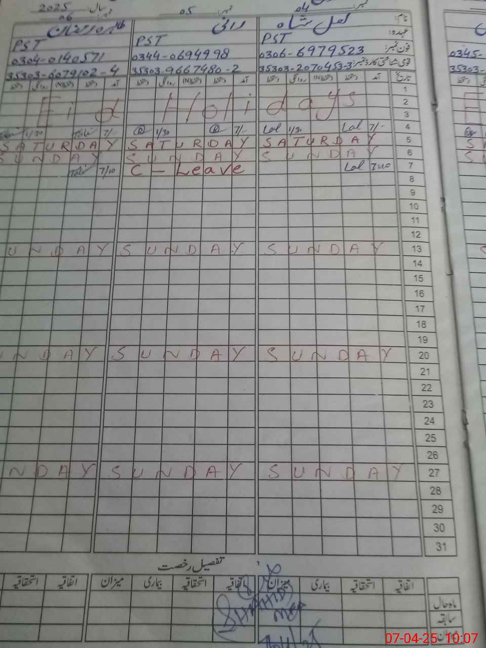 | CNIC | Full Name | Designation | R/C | Absence During Last Calender Month |