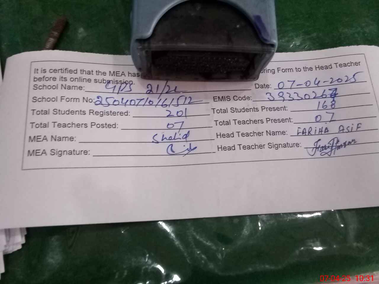 | Certified that this School was Inspected by the Undersigned MEA/DMO Today and the Information Stated Above is as Per Record. | |||||