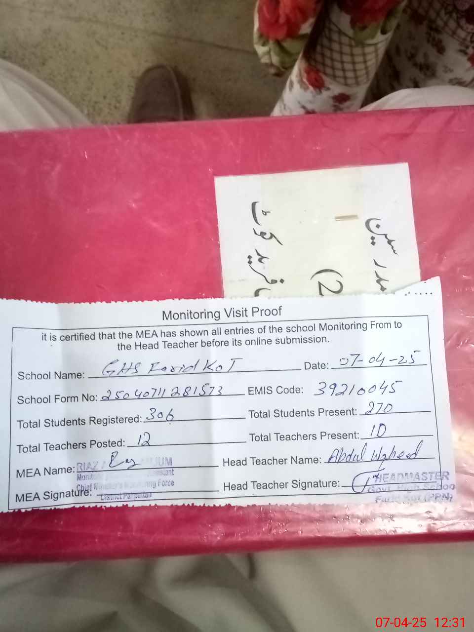 | EMIS Code: 39210045 | Name of School: GHS FARID KOT P/O PAKPATTAN | |||
