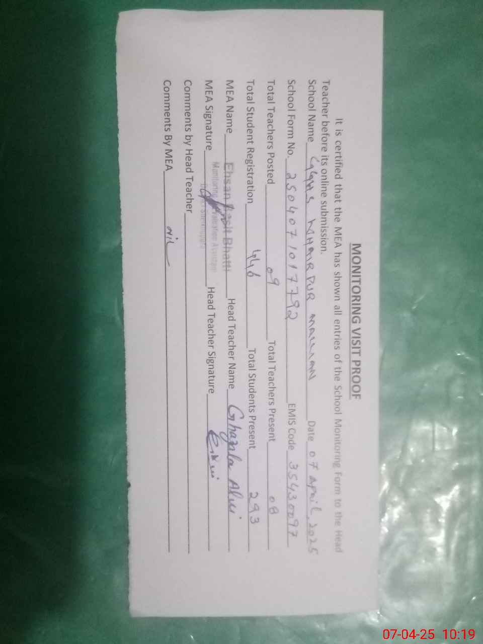 | Certified that this School was Inspected by the Undersigned MEA/DMO Today and the Information Stated Above is as Per Record. | |||||