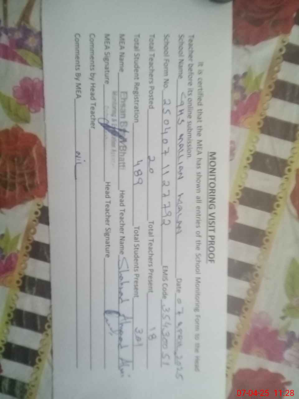 | Certified that this School was Inspected by the Undersigned MEA/DMO Today and the Information Stated Above is as Per Record. | |||||