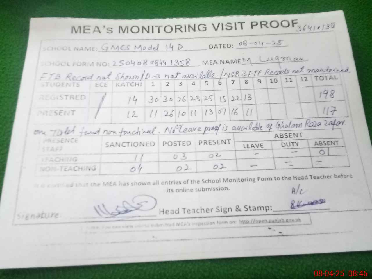 | Remarks (Use Separate Page if Required): FTF and NSB expenditure record registers not maintained D3 form not available One toilet was non functional as blocked C leave proof of teacher Ghulam Raza Zafar was not available | |||||