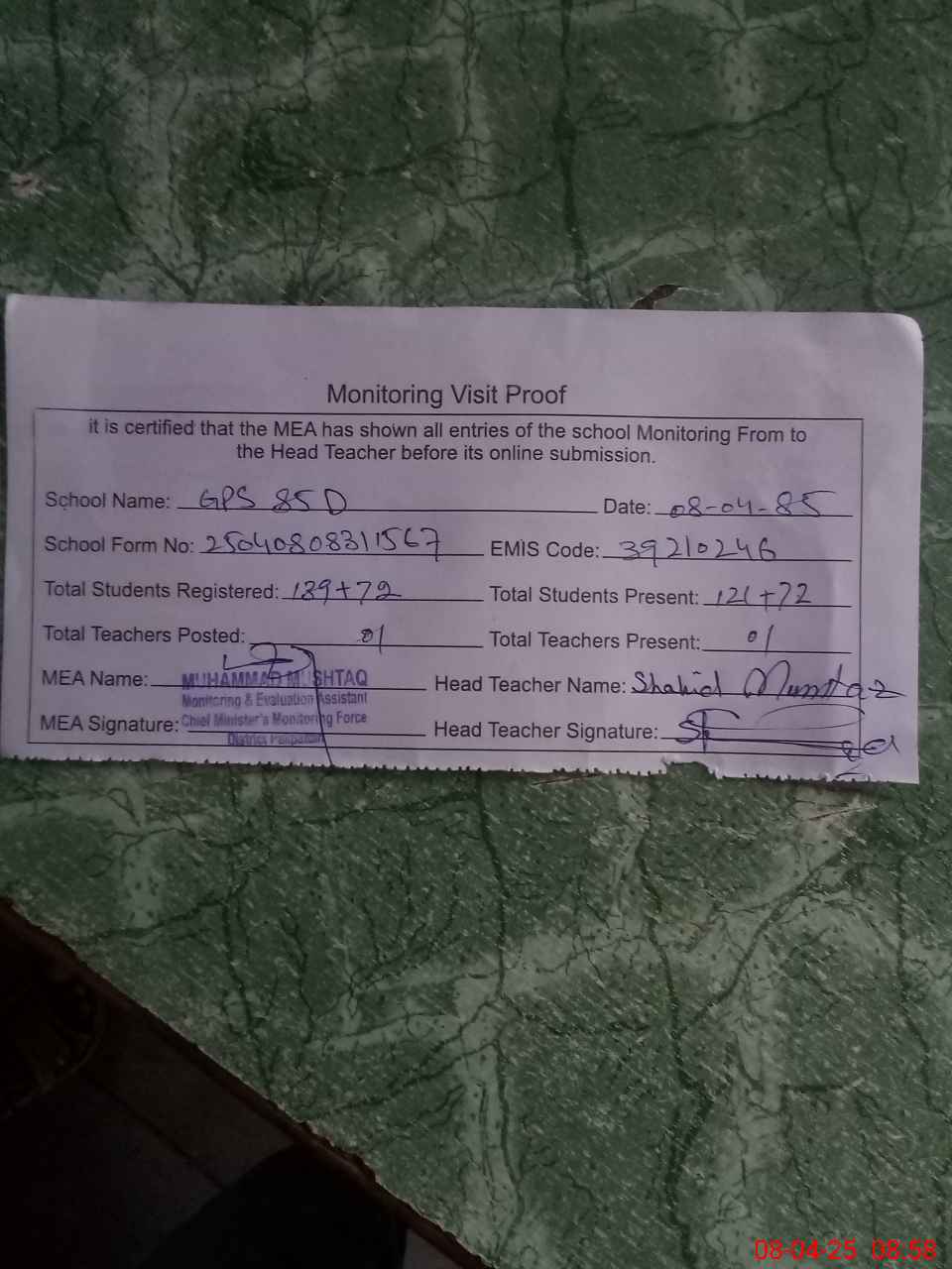 | Attendance Register | Head Teacher | MEA with School | Visit Proof |