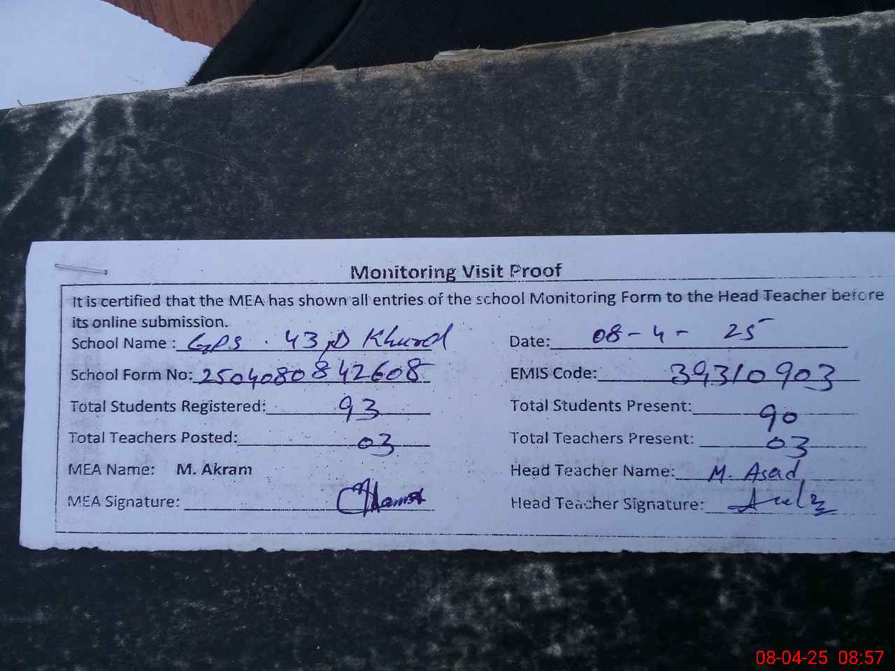 | EMIS Code: 39310903 | Name of School: GPS CHAK 43 D KHURD | |||