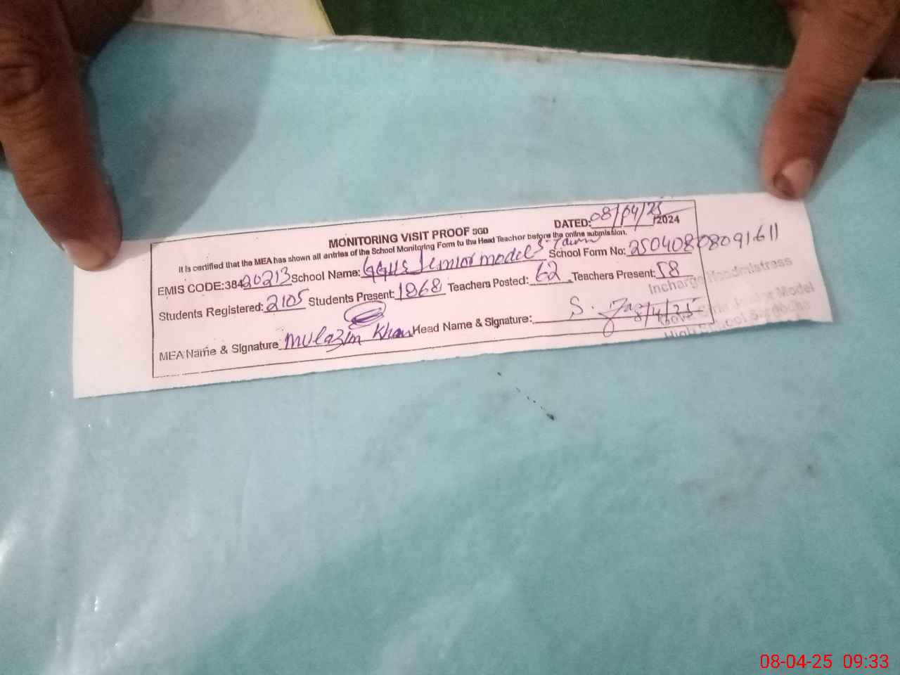 | EMIS Code: 38420213 | Name of School: GGHS JUNIOR MODEL SATTELITE TOWN SARGODHA | |||