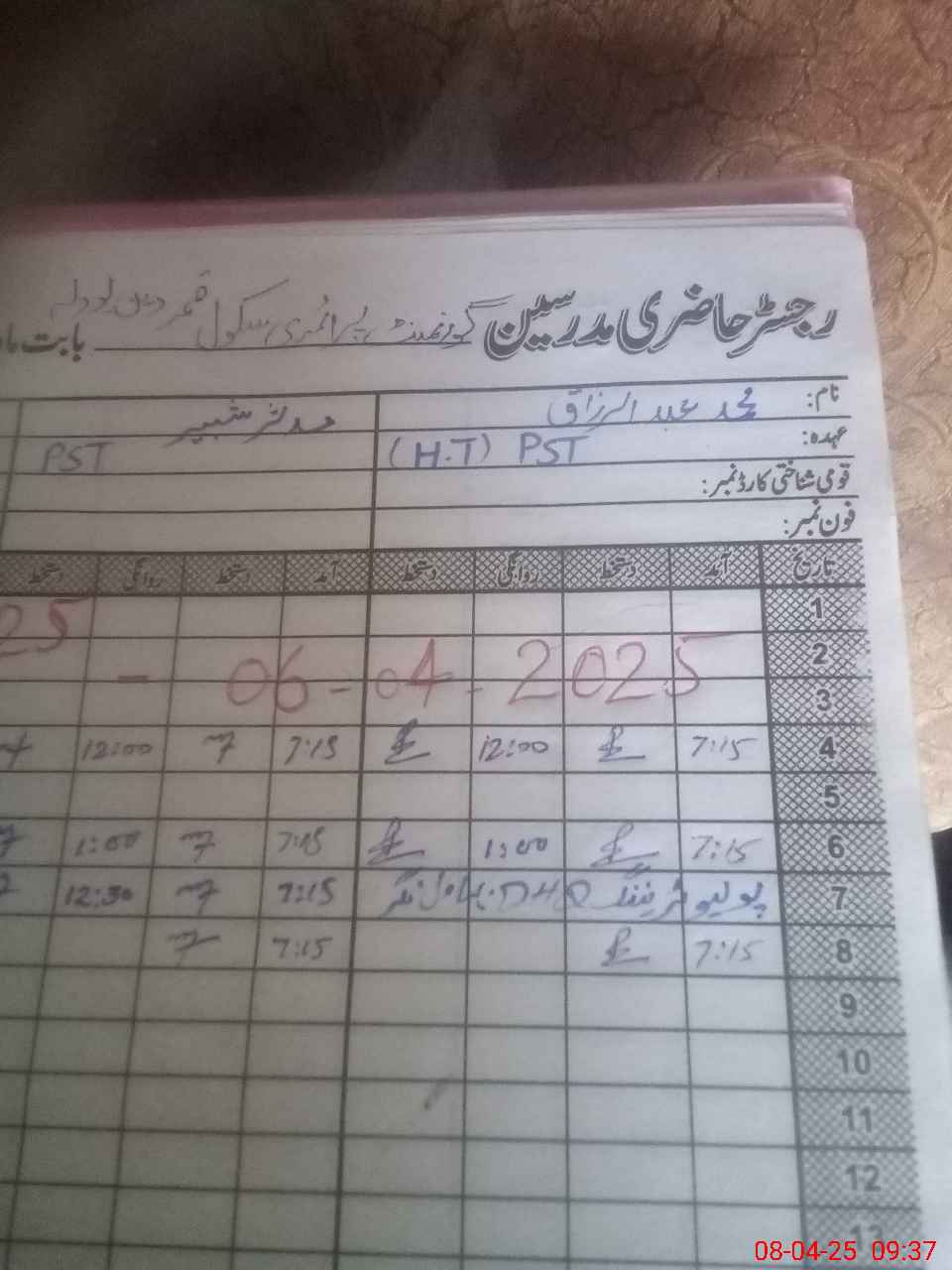 | Name: ARa**** Designation: (School Headmaster's/Headmistress's) PST Phone/Cell Number: 03**** |